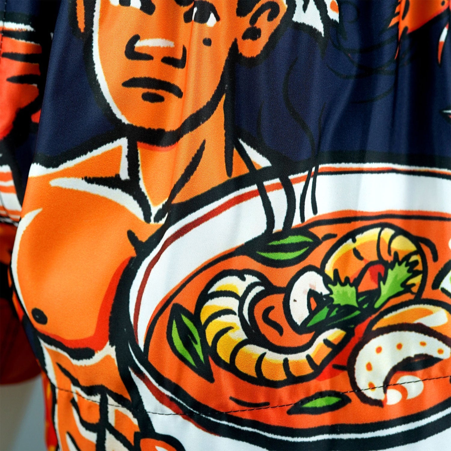 Vivid shrimp motifs leap across a fiery broth of reds, oranges, and lime-greens. Lemongrass and chili silhouettes swirl in the background like rising steam. It’s a design that simmers with energy and bursts with attitude.